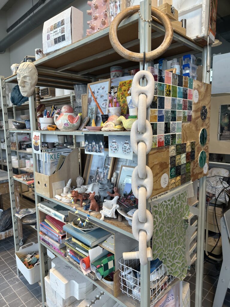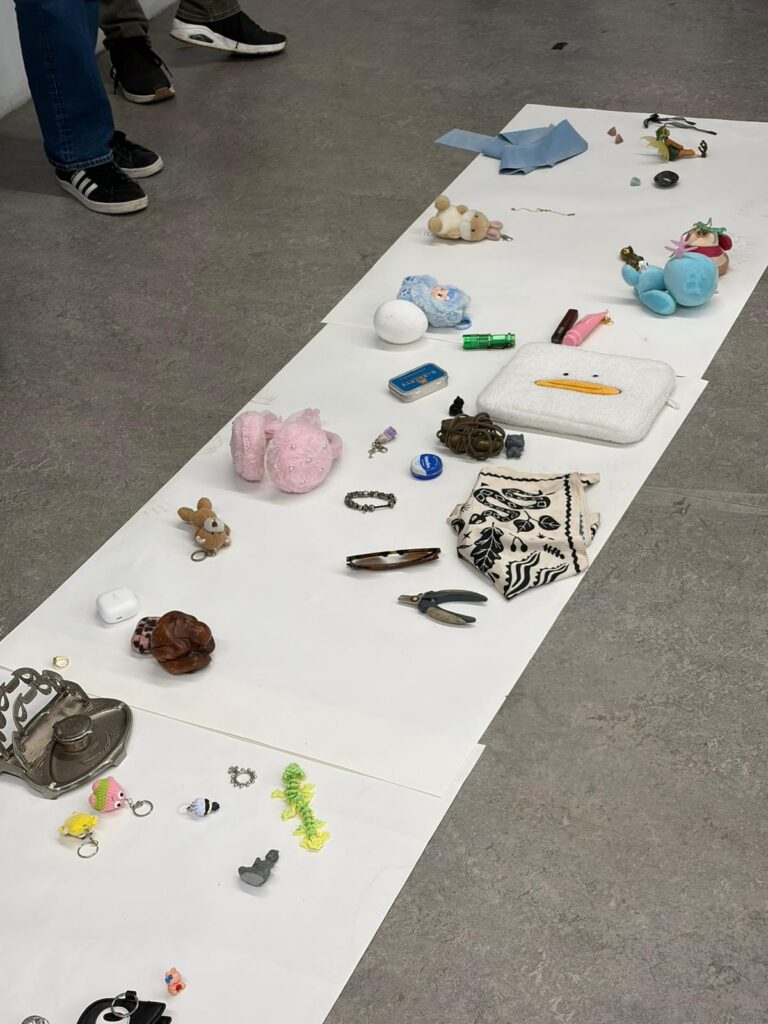 Alle studenten die mee waren op de excursie moesten hun voorwerpen op een lange witte strook papier leggen. Daarna gingen we samen kijken hoe de vormen bij elkaar pasten. We legden de voorwerpen bijvoorbeeld van hard naar zacht. Het was super interessant om te zien wat iedereen had meegenomen en om met elkaar te praten over waarom we bepaalde keuzes maakten.