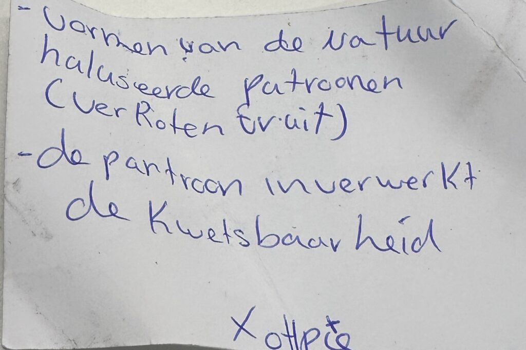 Ik had gevraagd waarom ze karakters erin had verwerkt en dat was gedaan om herkenning te geven aan mensen en dat ze er langer naar gingen kijken. Ik vond dat leuk gedaan. En ook dat de kleuren over elkaar staan in de kleuren cirkel van blauw en rood.